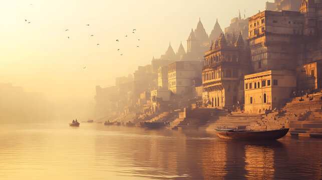 Serene sunrise over the Ganges River with boats near the ancient ghats of Varanasi