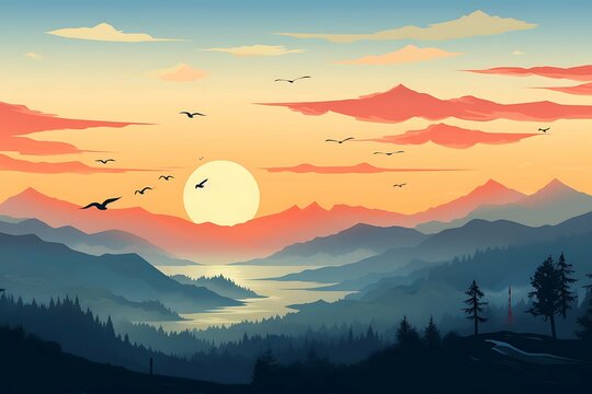 Stylized depiction of a majestic sunrise over mountains with a reflective lake and soaring birds. Generative AI