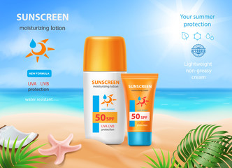 Sun protection sunscreen advertising. Sunblock cream tube on summer beach background.