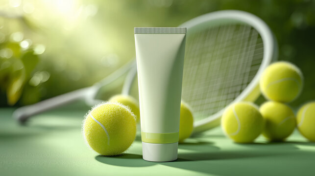 Tennis cream tube with tennis balls, sport theme, on green court background