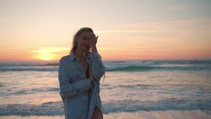 Happy woman in bikini and denim shirt against sunset on ocean. Smiling lady walking on beach in evening, looking at camera. Romantic summer vacations under orange sky.