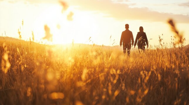 People holding hands in a field at sunset