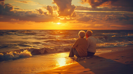An elderly couple enjoying a sunset on the beach. Elderly Couple Sunset Beach Scenic Relaxation Nature Outdoors Peaceful Romantic.
