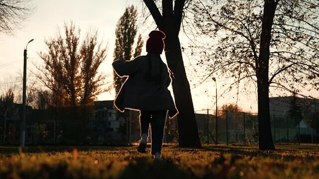 Stylish girl in cozy clothes runs looking at town old buildings. Little girl in woollen coat runs on lawn in urban park. Active girl silhouette in warm attire enjoys evening run to horizon at sunset