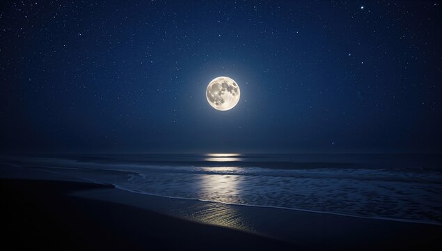 Super moon shining over a starry sky above a tranquil beach, enhancing nighttime serenity