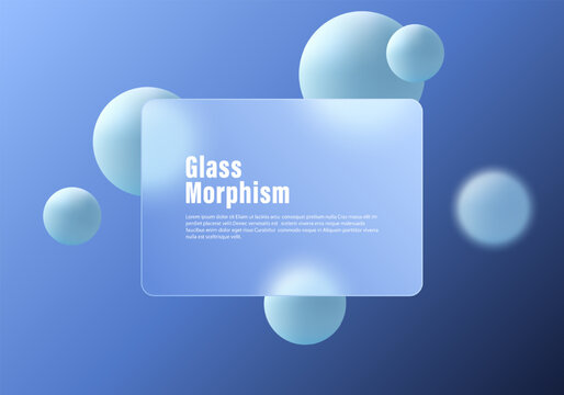 Trendy website landing page template in glass morphism style. Imitation of transparent glass panel with the effect of superimposition on volumetric gradient spheres.
