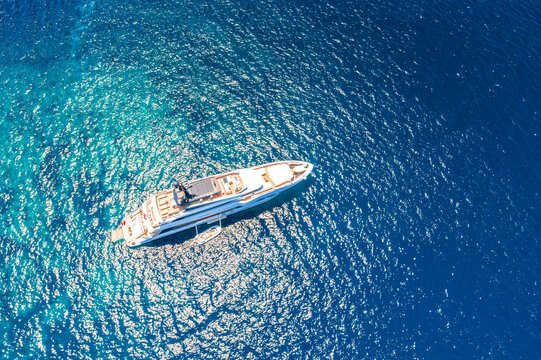 Luxury white yacht navigates into beautiful blue water near Zakynthos island. View from the top of a large white yacht at Navagio Beach.
