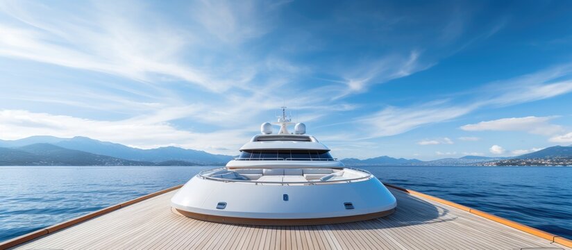 Modern superyacht bow featuring teak deck and stainless steel fixtures under a clear blue sky, with serene sea and distant mountains in view.