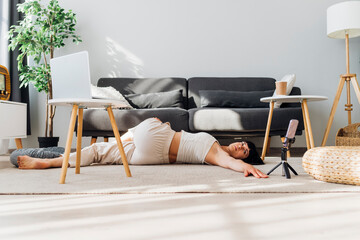 Attractive young woman working out in living room, doing yoga exercise on wooden floor, lying in Belly Twist Pose, Jathara Parivartanasana, resting after practice, full length, top view