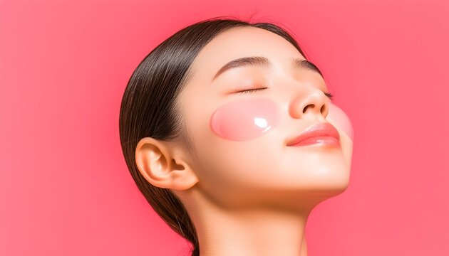 Serene woman with translucent pink face patches on a vibrant pink background, eyes closed, enjoying a beauty treatment