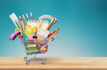 Variety office supplies in little shopping cart on wooden table  on background