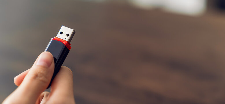Hand holding usb flash drive with connecting to laptop at wooden table