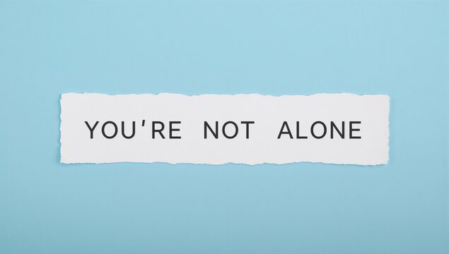 Torn white sticky note on blue background with message YOU'RE NOT ALONE, theme of encouragement during tough times