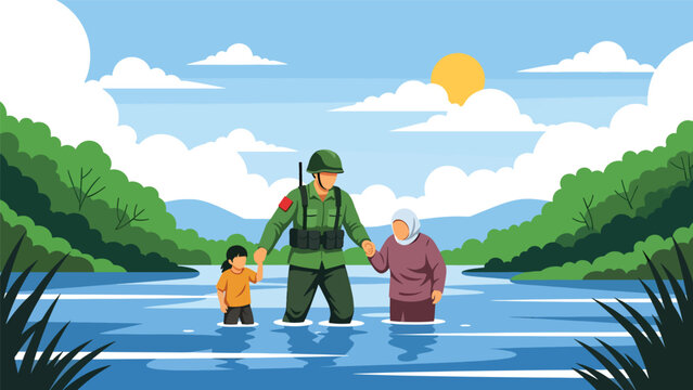 Soldier assisting refugees crossing river, vector illustration expressing humanitarian military service, compassion, protection, rescue effort, and support for displaced civilians