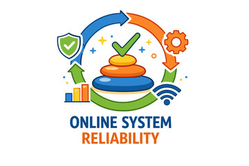 Online system reliability concept with arrows, checkmark, graph, gear, and wi-fi symbols