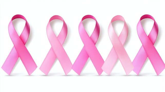 Five pink ribbons arranged in a row against a white background. Shades of pink vary slightly. Soft lighting and subtle shadows.