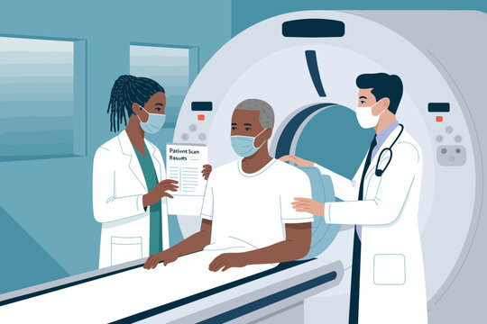 A patient sits in front of a CT scanner, receiving test results from two doctors, emphasizing the importance of diagnostic imaging in healthcare and patient guidance.