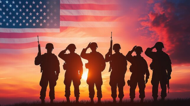 Silhouetted soldiers salute against a vibrant sunset, with the American flag prominently displayed, symbolizing patriotism and honor.
