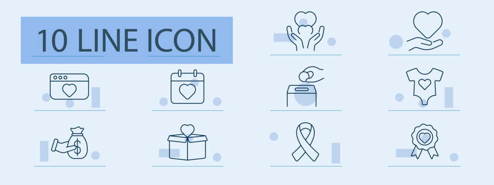 Charity set icon. Heart, hand, calendar, box, ribbon, donation, money, clothes, medal, care, hope, support, help, event, community, kindness, awareness, gift, volunteer