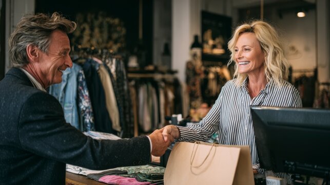 A Warm Encounter Between a Customer and Shopkeeper in a Fashion Boutique, Showcasing a Friendly and Inviting Shopping Experience. Checkout retail process