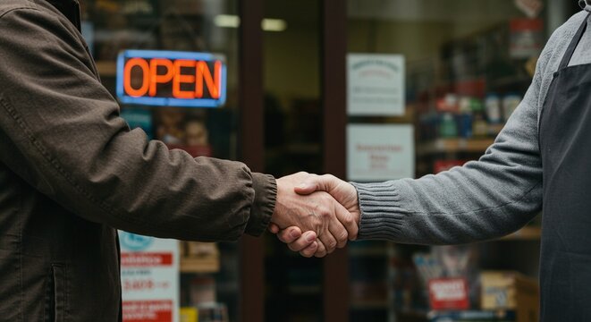 Two individuals clasp hands in a warm handshake in front of an open business, suggesting an agreement or partnership.