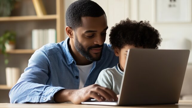 A father and young son sitting at a wooden desk, setting up parental controls on a laptop, fostering responsible internet use, warm and supportive family dynamic