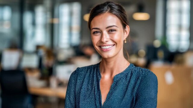 A confident employee stands in a bright, modern workspace with supportive colleagues nearby