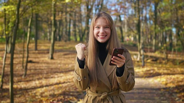 Front view of attractive, young lady standing in park, using smartphone. Glad, happy female reading, texting, wondering, looking at camera. Concept of modern, urban lifestyle.