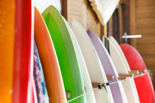 Vibrant orange and blue surfboard isolated on a neutral backdrop for summer sports and beach vibes