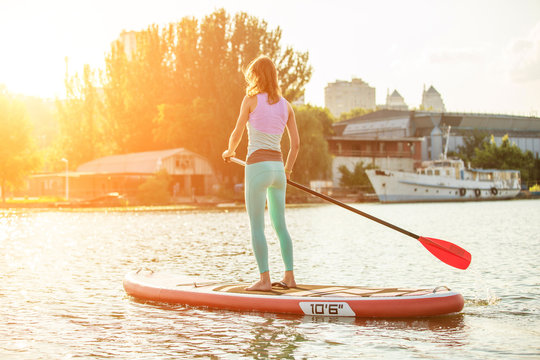Woman is floating on a SUP board on sunny morning. Stand up paddle boarding - awesome active recreation during vacation.