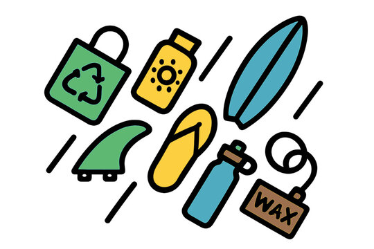 Colorful collection of surf and beach gear including flip flops, surfboard, and eco-friendly reusable items