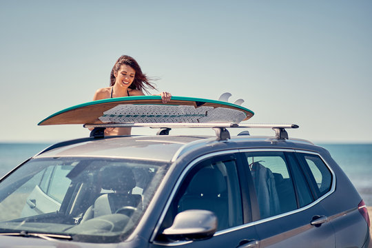 Summer holiday road trip vacation- surfer girl at the beach getting ready for surfing.