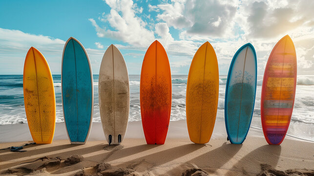 colored surfboards standing on a sandy beach against a serene blue ocean backdrop. copy space for text.
