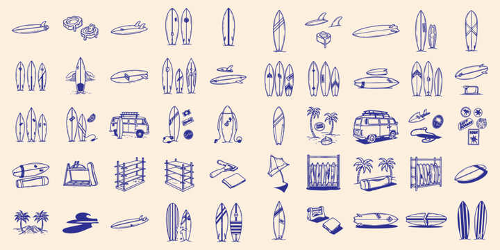 Hand Drawn Summer Surfboard and Tropical Beach Icon Set – Vector Doodle Style Ocean Elements, Van, Boards, Palms, and Vacation Accessories Collection