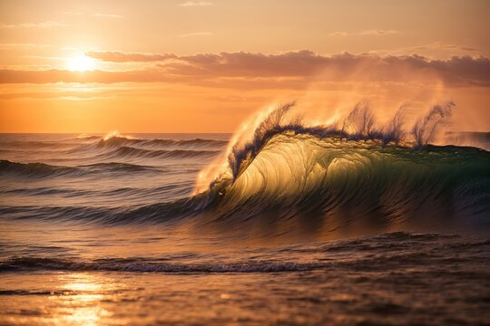 The ocean's crashing waves produce an amazing display of colors and textures as the sun sets over the water. Consider a surfer riding the final wave of the day against the vivid