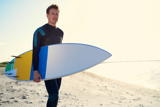Smiling surfer holding surfboard at sunny beach for sports enthusiasts