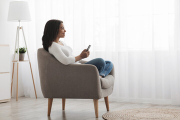 Relaxed black lady sitting in armchair and using smartphone at home, chatting on web, checking email, sending message or having online video call, side view, copy space