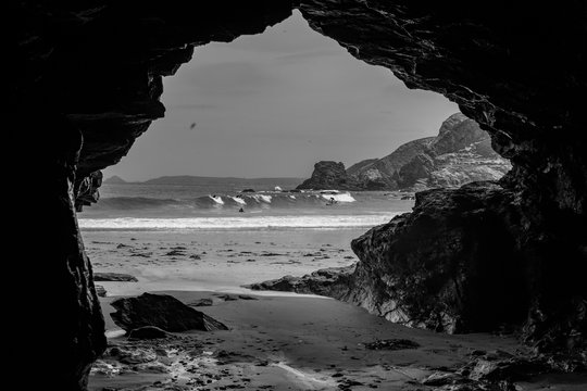 An up - close view of an epic wave that vividly showcases the raw power and captivating beauty of nature's surf culture. The wave, with its towering crest and foaming whitecaps.