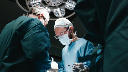 Surgeons in sterile operating room, focused on intricate procedure, illuminated by surgical lights, showcasing teamwork and precision in medical practice