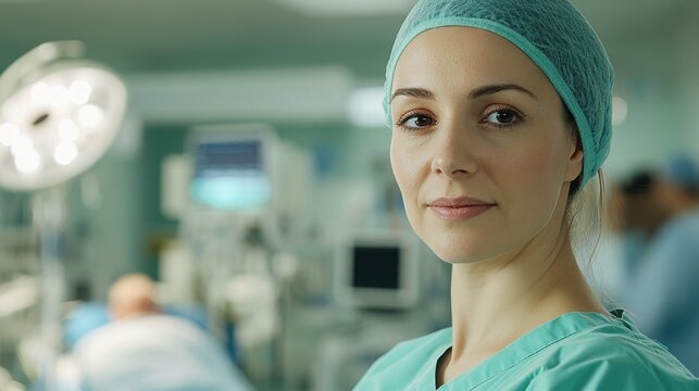 Nurse in surgical attire and protective gear against a vibrant blue background, showcasing focused attention and dedication to patient care.