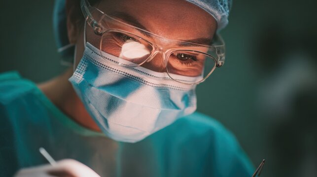 A focused surgeon in scrubs and protective gear is performing a procedure with precision, This image is ideal for healthcare, medical training, or depicting surgical environments,