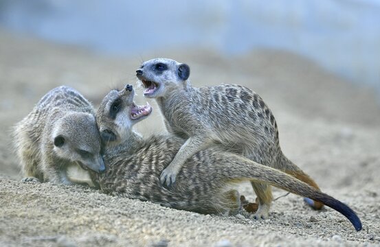 Meerkats or suricates (Suricata suricatta), pups play fighting, captive