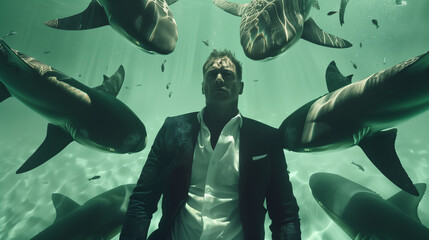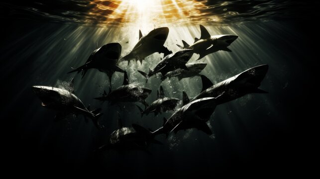 Swimmer surrounded by silhouetted sharks in a captivating and dramatic underwater setting