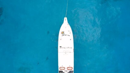 Man meditates on beach, surrounded by sharks in turquoise ocean.