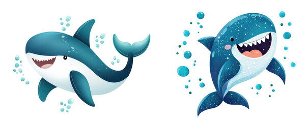 Vibrant underwater scene featuring two majestic sharks swimming gracefully in blue ocean waters, surrounded by diverse marine life.