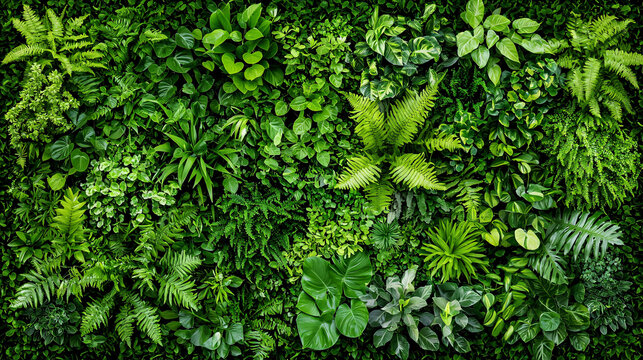 Lush green foliage creates a vibrant natural wall, a textured tapestry of various plants and ferns outdoors.