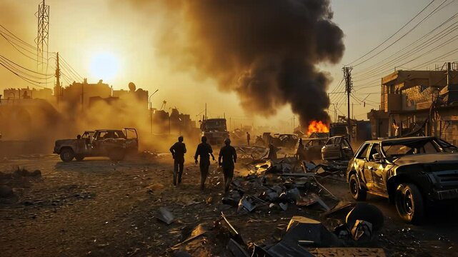 A child in a war-torn city architecture, conflict in middle east, loop animation