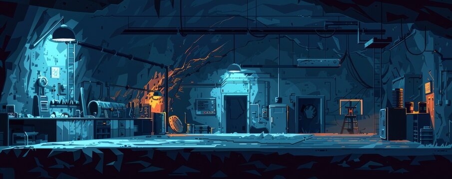 An underground bunker network inhabited by survivors of a global catastrophe, illuminated by dim lights.   illustration.