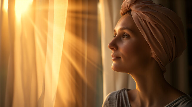 emotion and looking out the window after chemotherapy at hospital, cancer female feeling calm and positive hope thinking.