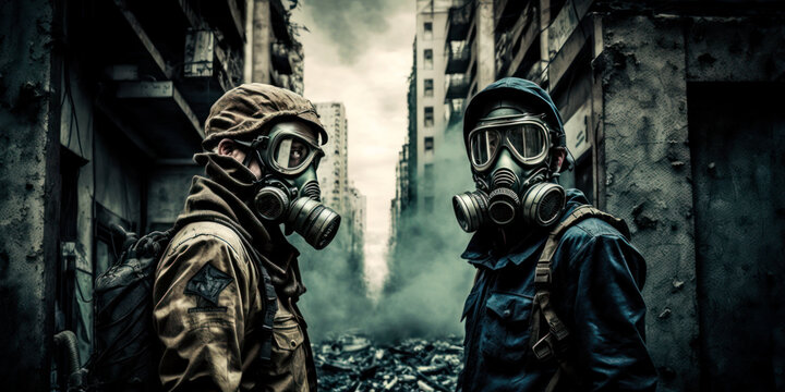 dos militares uniformados con mascara de gas en una zona en guerra catastrofica, generative ai